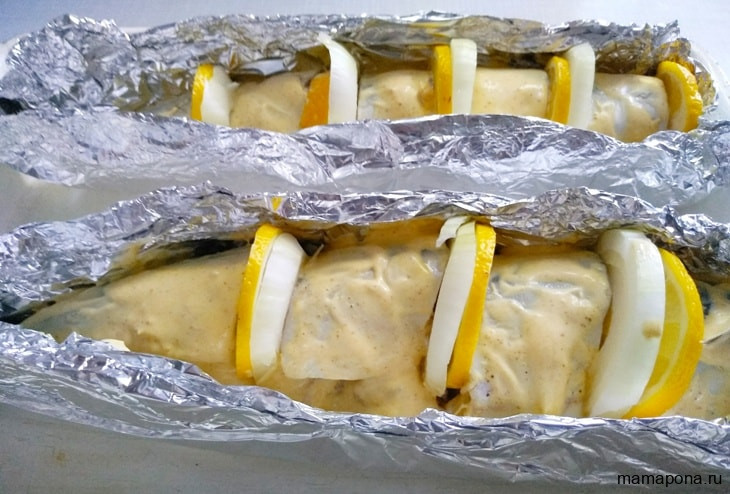 - З фольги зробіть «човники» та викладіть шарами скумбрію, лимон і цибулю.