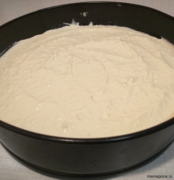 Сирний шар: змішати творог, сметану, цукор і ванілін. Додати розчинений у гарячому молоці желатин, перемішати й вилити на основу. Поставити в холодильник на 1,5–2 год.