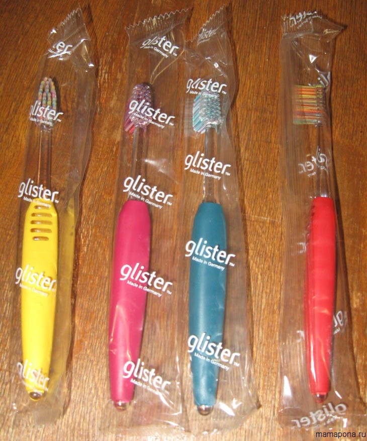 Упаковка розміром, як упаковка від зубної пасти. Усередині чотири щітки з ручками різних кольорів. Кожна щітка у герметичній упаковці. У порівнянні з дорослими, дитячі трохи дешевші. По м’якості м’якше дорослих. Основа ручки прозора пластмаса, ручка гумова. Гострого нічого немає, якість відмінна.